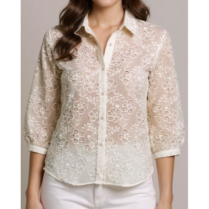 3/4 Sleeve Embroidered Shirt - Natural