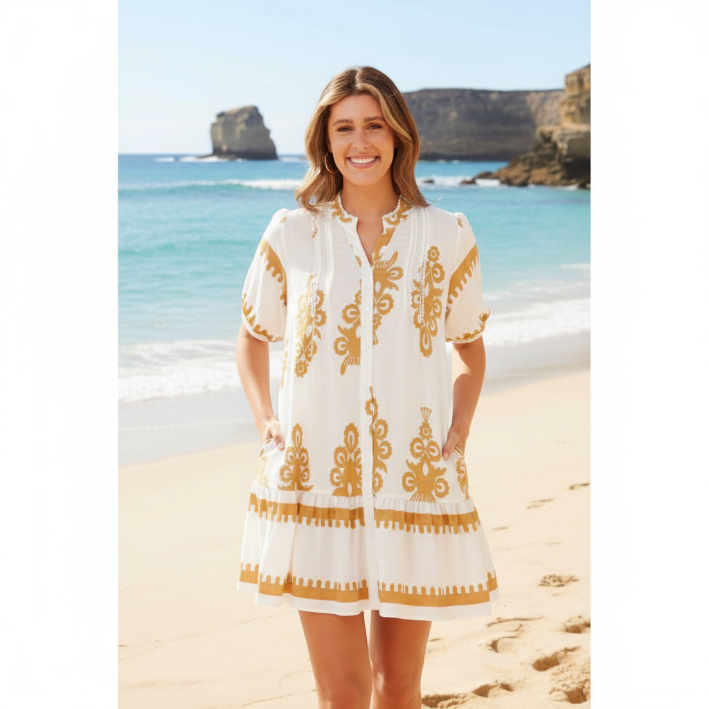 The dress features a stylish border print that adds a touch of elegance! Ideal for a casual day out or a weekend getaway, pair it with sandals for a relaxed yet stylish look!