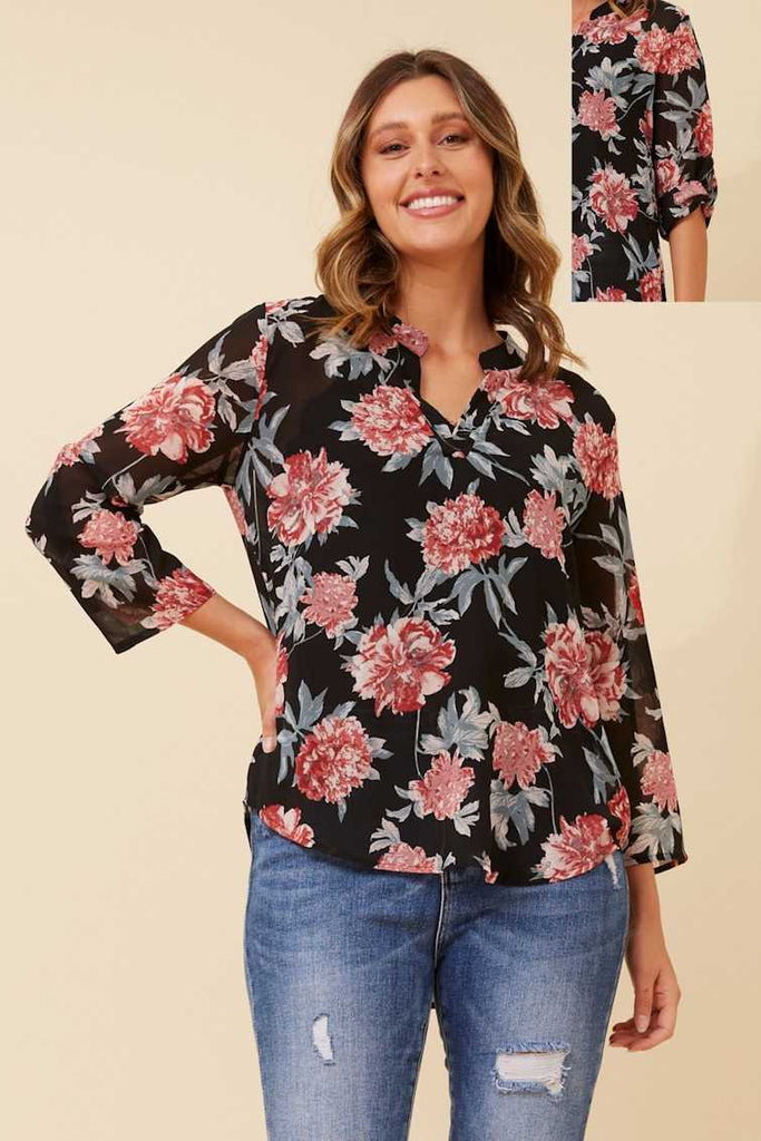 Expertly crafted from premium georgette material, this Floral Printed Blouse features a sophisticated Mandarin Collar and stylish 3/4 Roll-up Sleeves in a sleek Black Print design.
