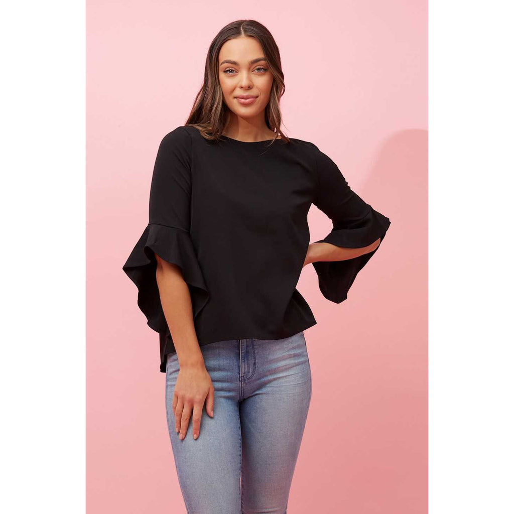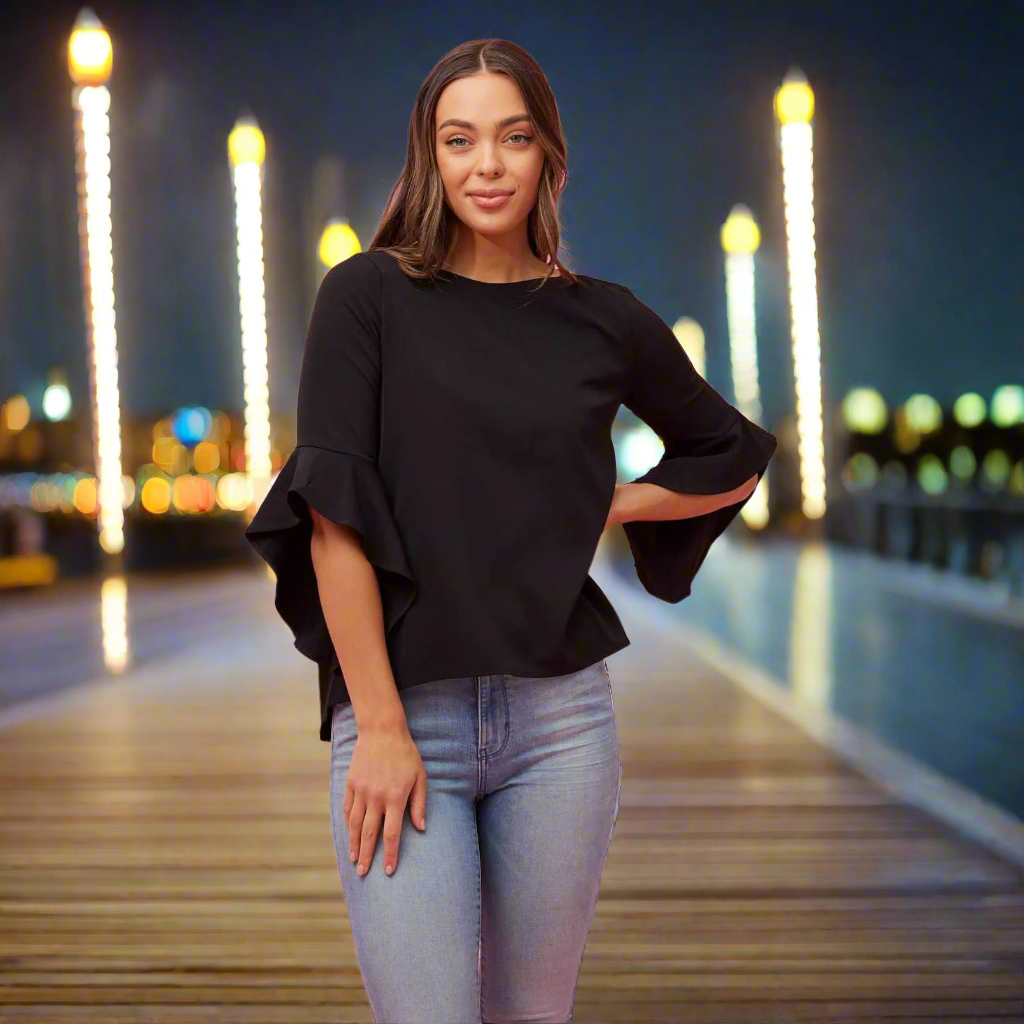 This black top features elegant bell sleeves that add a touch of sophistication to your outfit. Its comfortable fit makes it perfect for both casual and dressy occasions, helping you feel confident and stylish all day long.