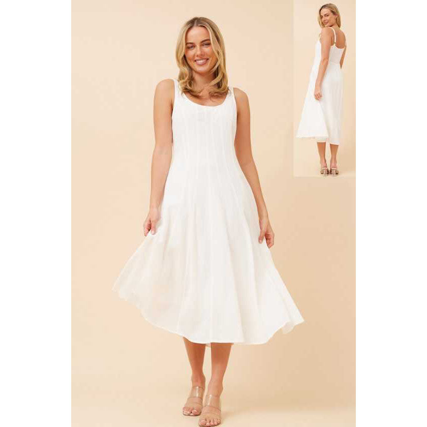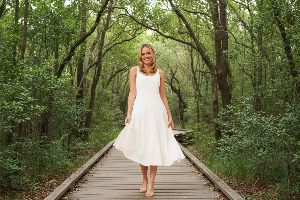 Effortless elegance meets timeless style with this sleeveless midi dress in crisp white. The clean, minimalist silhouette flatters every figure while the midi length offers refined sophistication for any occasion. Perfect for summer gatherings, casual brunches, or layered styling through the seasons. A versatile wardrobe essential that transitions seamlessly from day to evening.