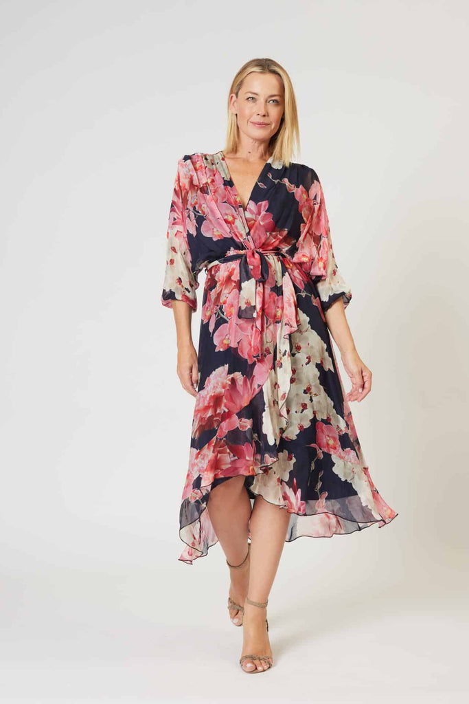 Cross Neckline Wrap Dress - Navy/Pink Floral