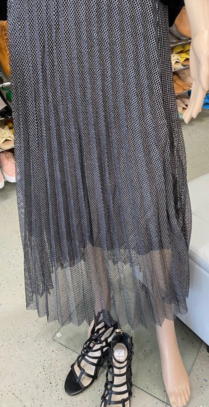 Elevate your style with our Metallic Mesh Skirt in Silver. Its stunning design exudes sophistication and exclusivity, making you stand out in any crowd. The intricate mesh fabric adds a touch of luxury, perfect for a glamorous look. Elevate your wardrobe with this statement piece.