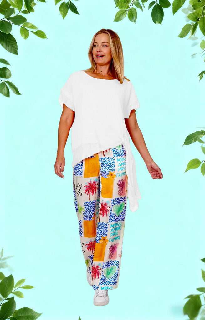 The La Strada Tie Detail Top brings a burst of vibrant colour with its tie-side feature and ruffled sleeves. The lightweight fabric keeps it breezy, while the back tie detail adds a fun twist. Perfect for pairing with printed or solid bottoms for an eye-catching look.
