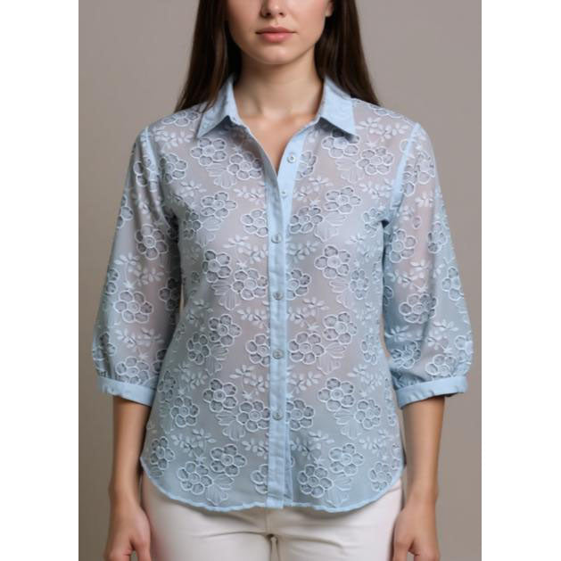 3/4 Sleeve Embroidered Shirt - Light Chambray