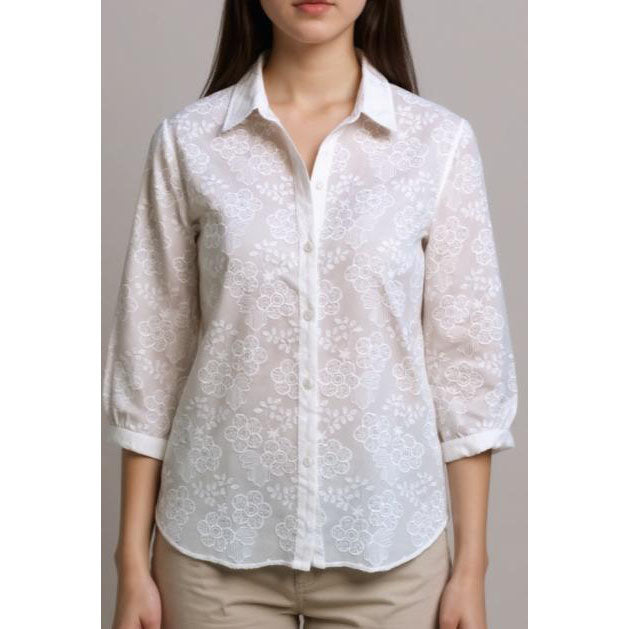 This 3/4 Sleeve Embroidered Top in Off White features a relaxed fit for comfortable wear. Crafted from 100% cotton, it offers breathable softness, while the embroidered details add subtle elegance. The button-front design with collar and hem cuffs provides a classic touch, making it easy to dress up or down for any occasion.