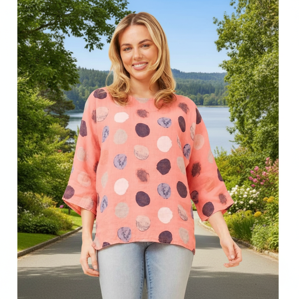 Our Made in Italy minimalist linen meets sweet blot print and relaxed 3/4th sleeves. With a light-weight airy fabric and relaxed fit, this top is a perfect summer staple! Match this with your favourite jeans and sandals to complete an effortless summer look!