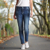 Featuring a classic skinny leg design and mid-rise waist, these jeans are both flattering and versatile. The addition of the side trim adds a touch of texture and visual interest, giving them a unique and eye-catching look.