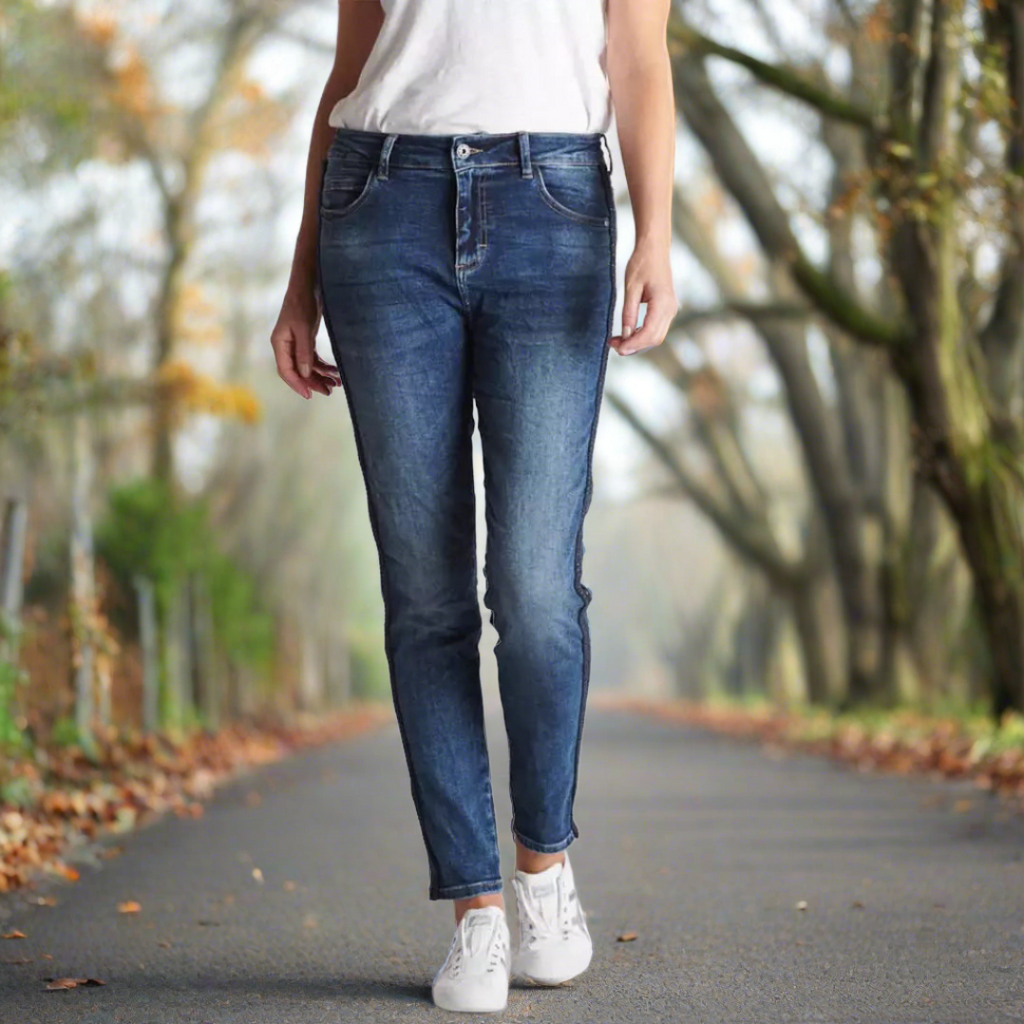 Dress them up with a blouse and heels for a night out or dress them down with a t-shirt and sneakers for a casual daytime look. The Italian Star Bus Stop Jeans with Side Trim are a must-have for any wardrobe, combining style and comfort in one beautiful piece. Their versatility and durability make them the perfect choice for any season and occasion, and their unique design ensures that they will stand out from the crowd.