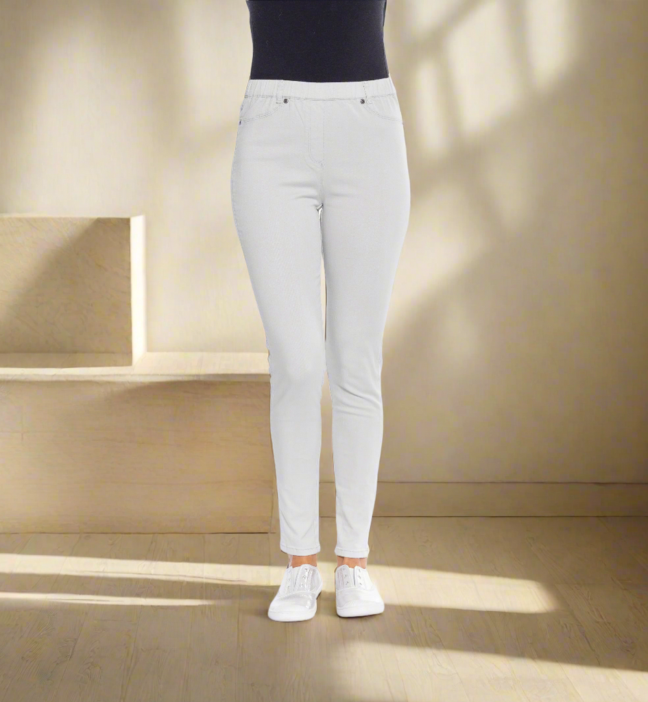 The pull-on design makes these jeggings easy to wear, offering a smooth, elastic waistband for added comfort without the need for zippers or buttons. These jeggings are full-length, making them a great option for all seasons. They provide the sleek look of leggings combined with the structure of jeans. Café Latte offers these jeggings in a variety of colours, making them a popular choice for building a versatile wardrobe.