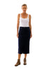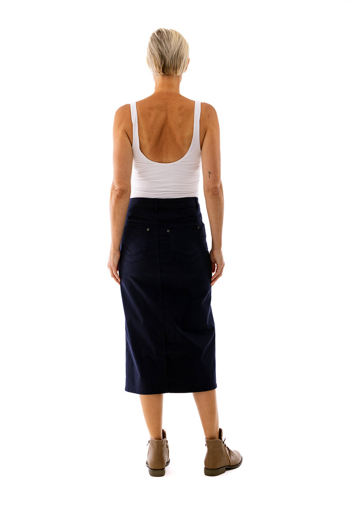Elevate your wardrobe with the Coloured Midi Denim Skirt by Cafe Latte. Made from 97% cotton and 3% spandex, this midi length jean skirt features a front split and adds a touch of bold color to any outfit. Versatile and stylish, this must-have piece effortlessly combines fashion and function. Dress it up or down for any occasion and exude elegance and sophistication.