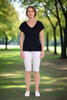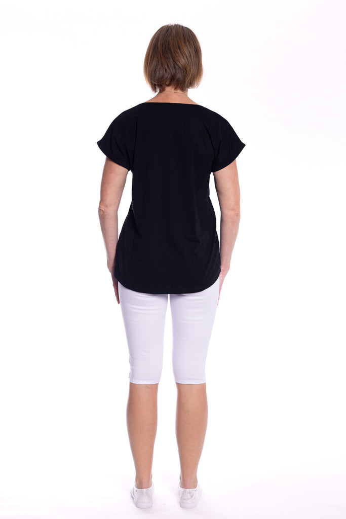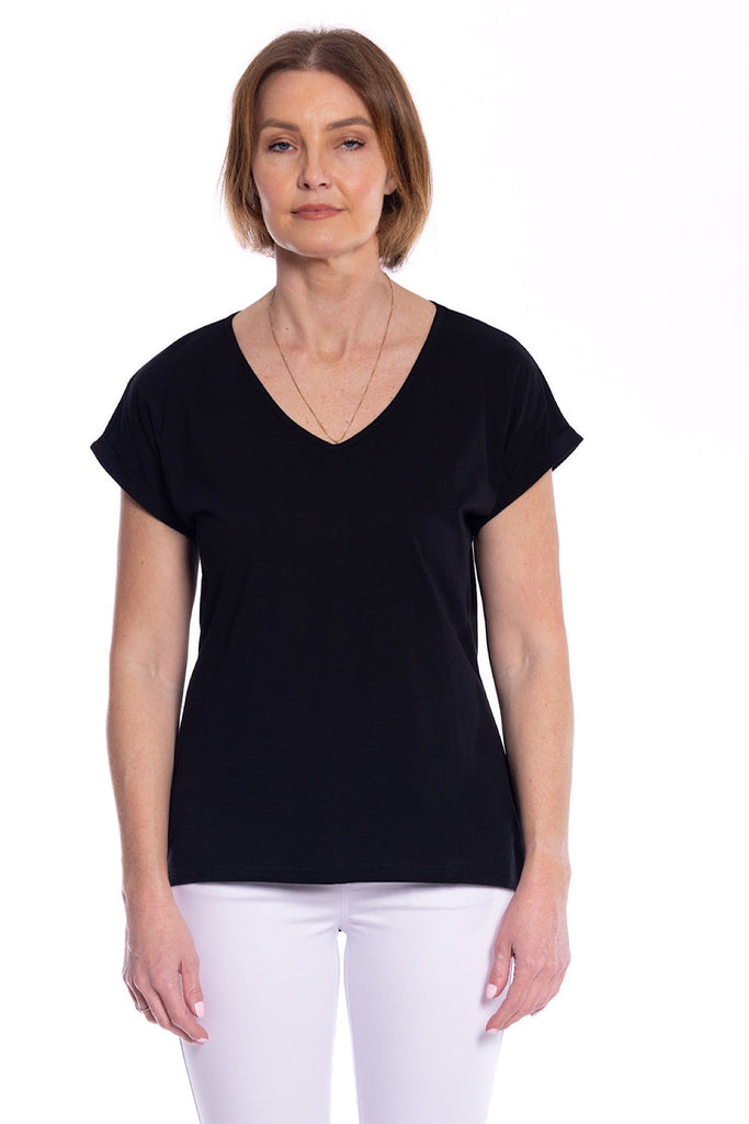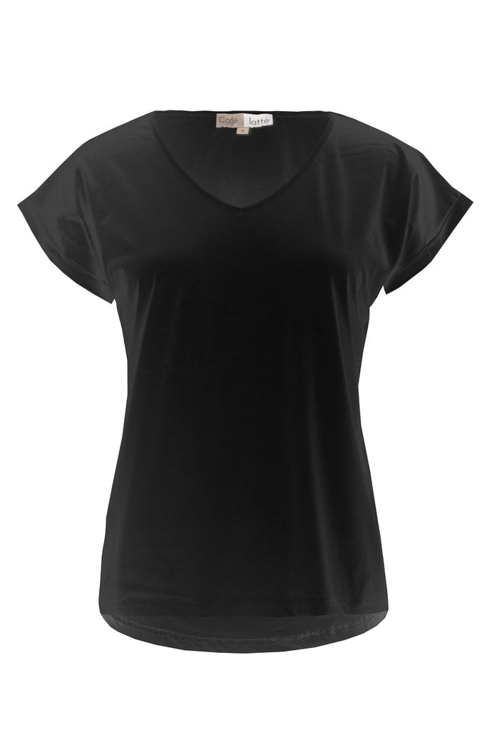The V-Neck Tee by Café Latte in Black is a versatile and comfortable piece, perfect for casual or everyday wear.