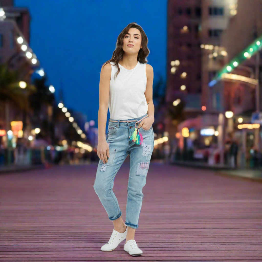 Our jeans feature a mid rise, button front with zip fly, contrast patchwork, detachable fluro waistbelt with tassels and great stretchy fit.