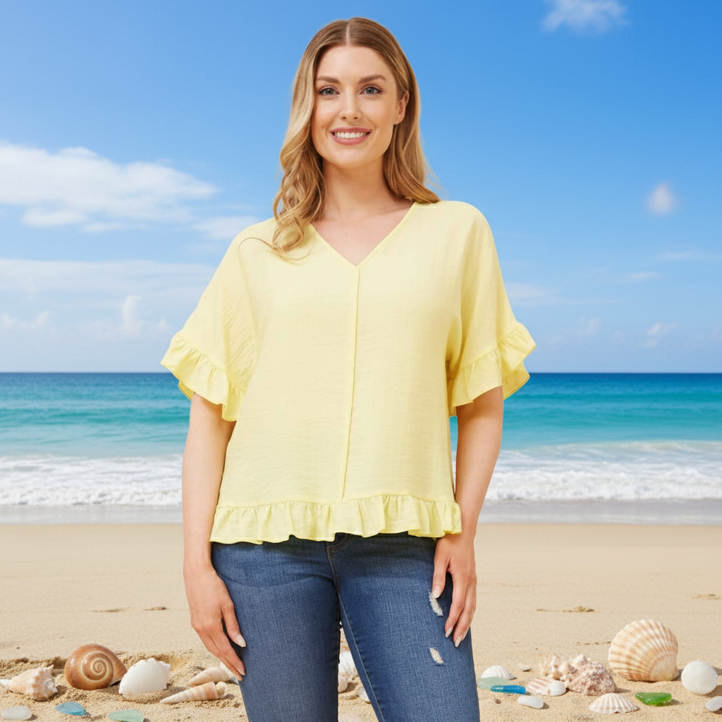 Elevate your everyday wardrobe with this refined V-neck top, crafted from a luxurious viscose nylon blend. The delicate frill detailing at the neckline adds an understated elegance, creating visual interest without compromising sophistication. The fluid fabric drapes beautifully, offering both comfort and a polished silhouette perfect for transitioning from office to evening occasions. A timeless piece that pairs effortlessly with tailored trousers or flowing skirts.