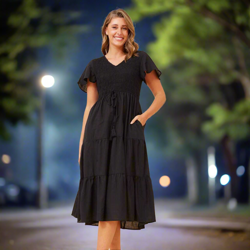 Our dress oozes effortless femininity. This piece will seamlessly transcend through the seasons! Pair with heels or sandals to complete your look!