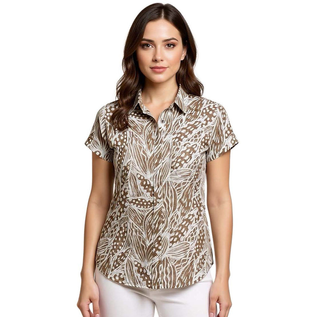 This lightweight shirt combines comfort and style with its soft 50% cotton and 50% rayon blend. Featuring a relaxed drop shoulder design, button-front closure, and two handy pockets, it offers practical elegance. The collared neckline and sleeve cuffs with tabs give it a polished finish, perfect for layering or wearing alone on casual days.