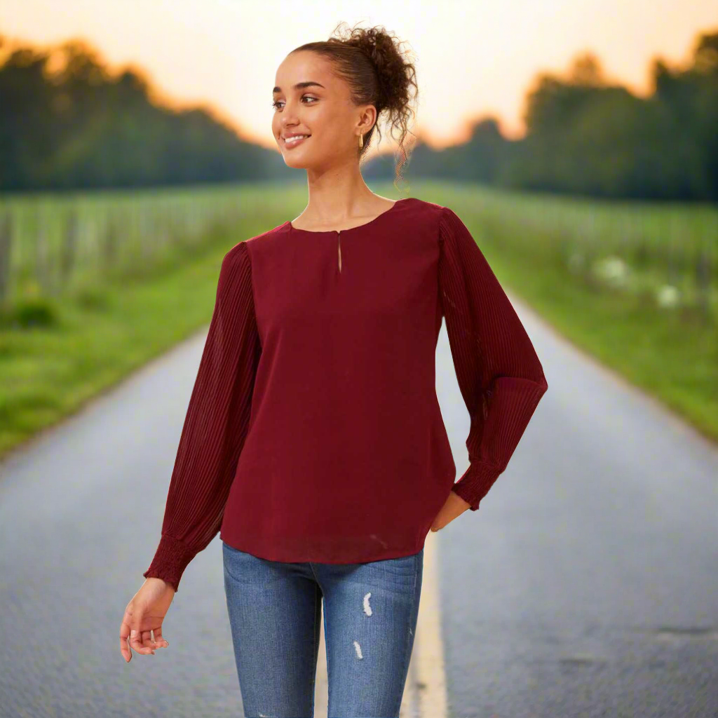 Blouse adds a touch of sophistication to your wardrobe. With its pleated sleeve, it’s perfect for workwear or dressier occasions. Pair with jeans or trousers for a chic, effortless look that’s full of elegance or pair tucked-in pencil skirt for an office look!