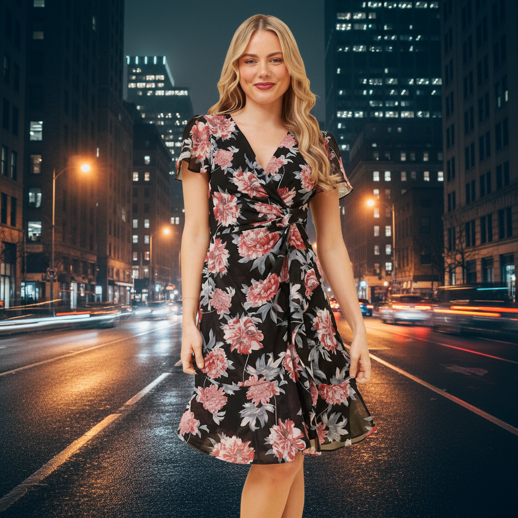 Elevate your everyday wardrobe with this striking short dress, crafted from luxurious black printed georgette. The defining tie waist creates an elegant silhouette that flatters and defines, while the fluid fabric drapes beautifully for effortless sophistication. Perfect for transitioning from day to evening, this versatile piece pairs seamlessly with heels or flats. The intricate print adds visual interest without compromising the refined aesthetic, making it an essential addition to any discerning wardrobe.