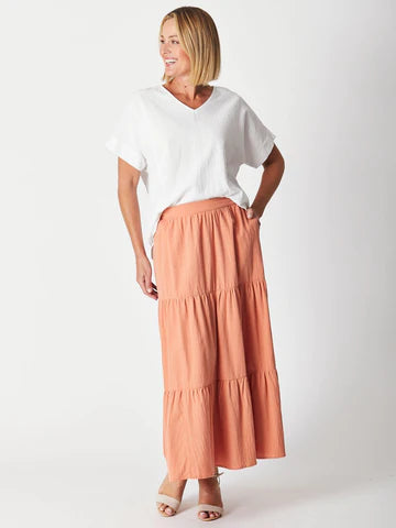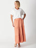 The Prudence Upcycle Skirt is a maxi-length style featuring side pockets, an elasticated waistband for added comfort with a flat front panel, and a beautiful amount of swing! Crafted from 100% upcycled cotton in a beautifully earthy peach-terracotta tone.