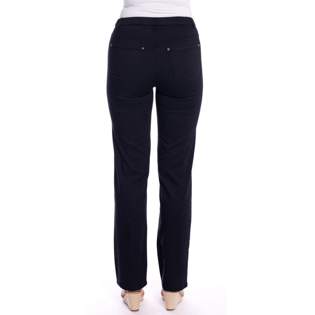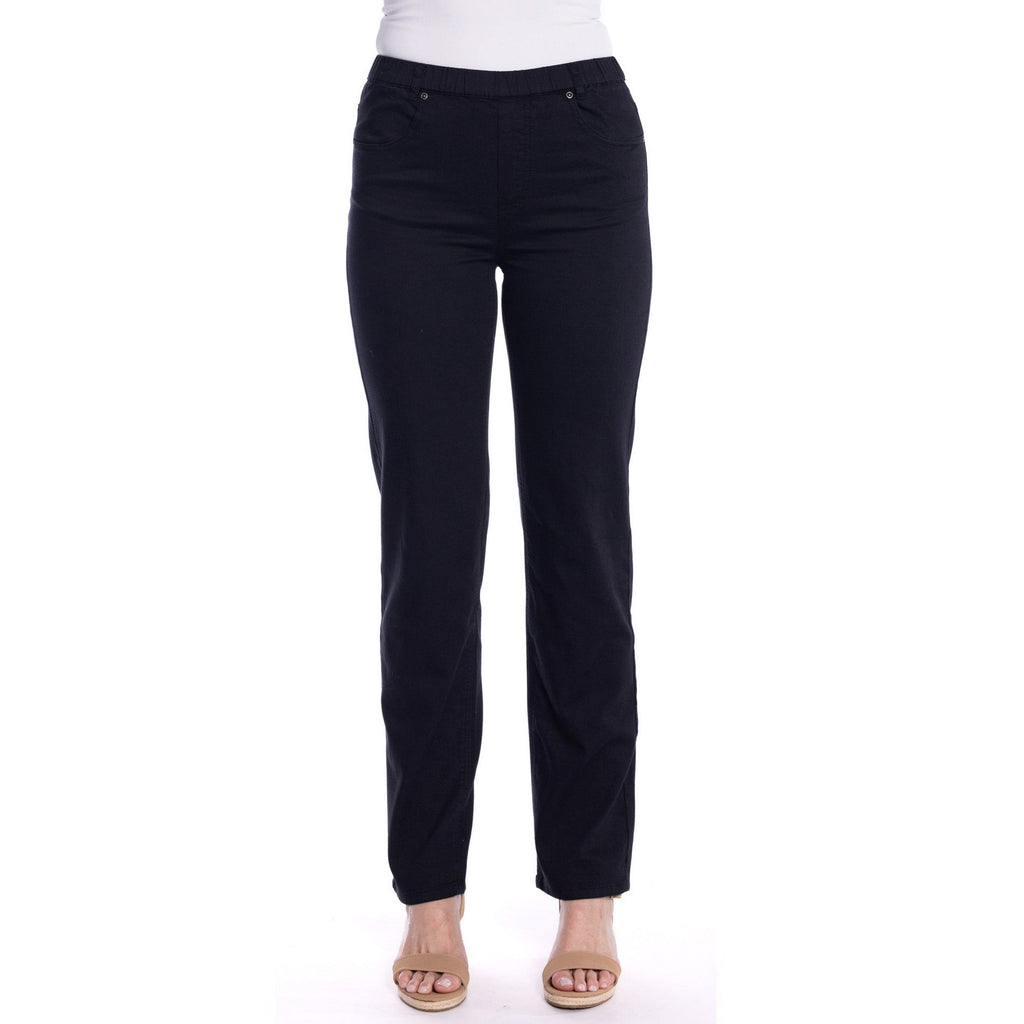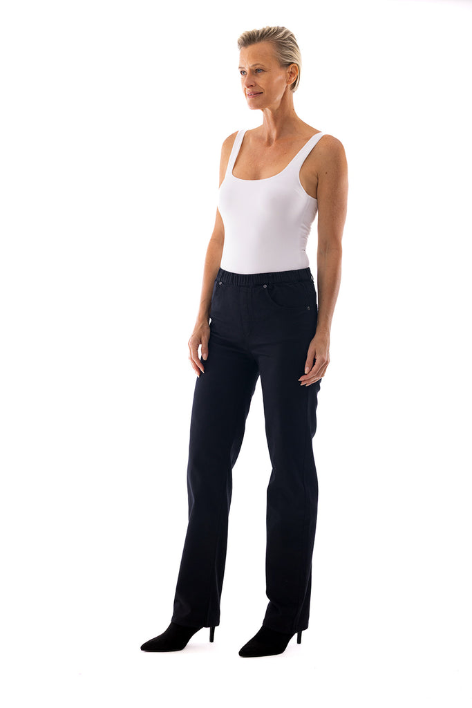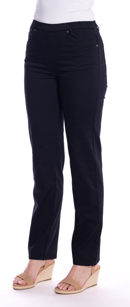 These jeans feature a pull-on design with an elastic waistband, making them easy to wear and comfortable throughout the day. The absence of buttons and zippers adds to the streamlined look and comfort.  The jeans are full-length, providing coverage and a sleek appearance, and have a straight leg with a slightly wider cut offering a modern take on classic jeans, making them flattering for various body types.  The jeans include both front and back pockets, adding functionality and a touch of classic jean styling.