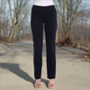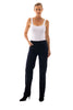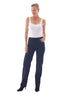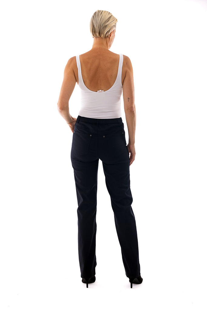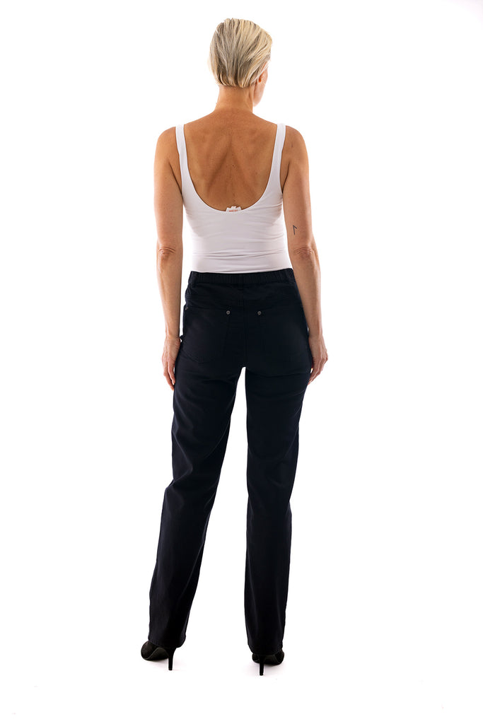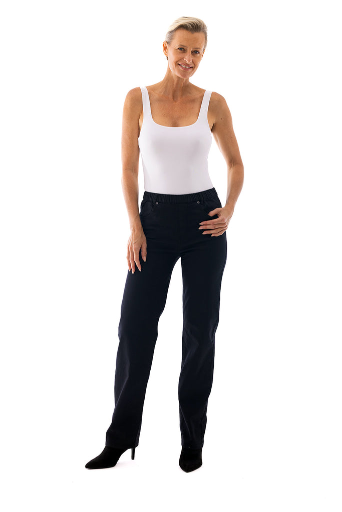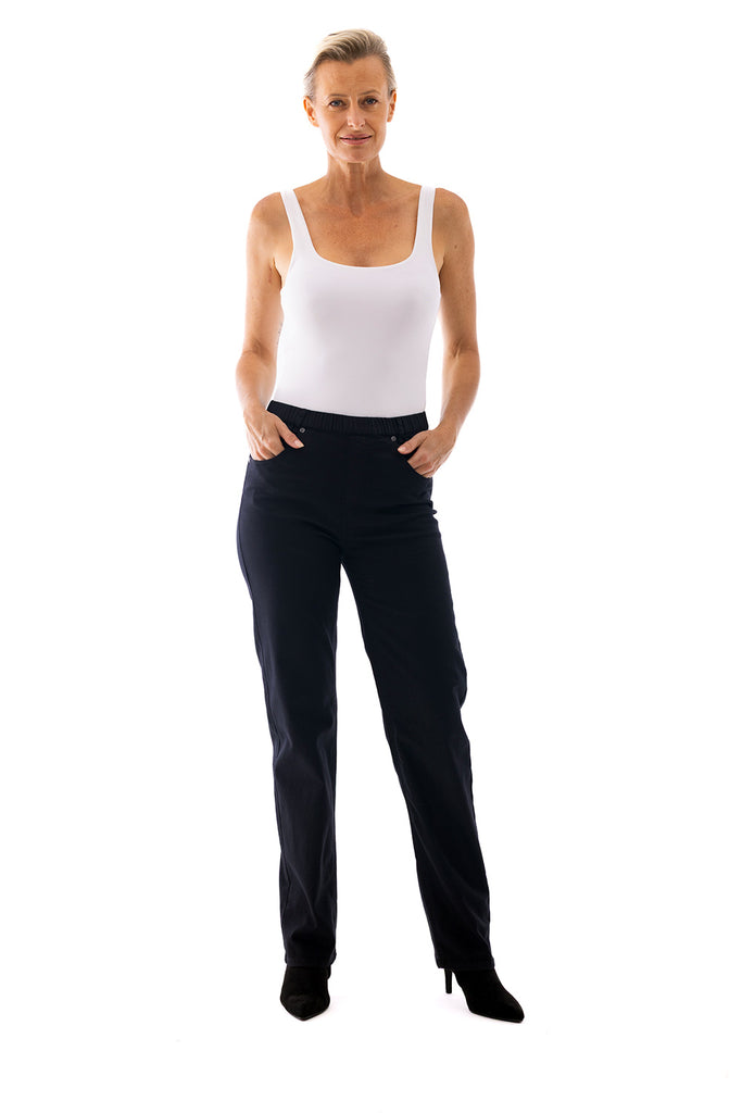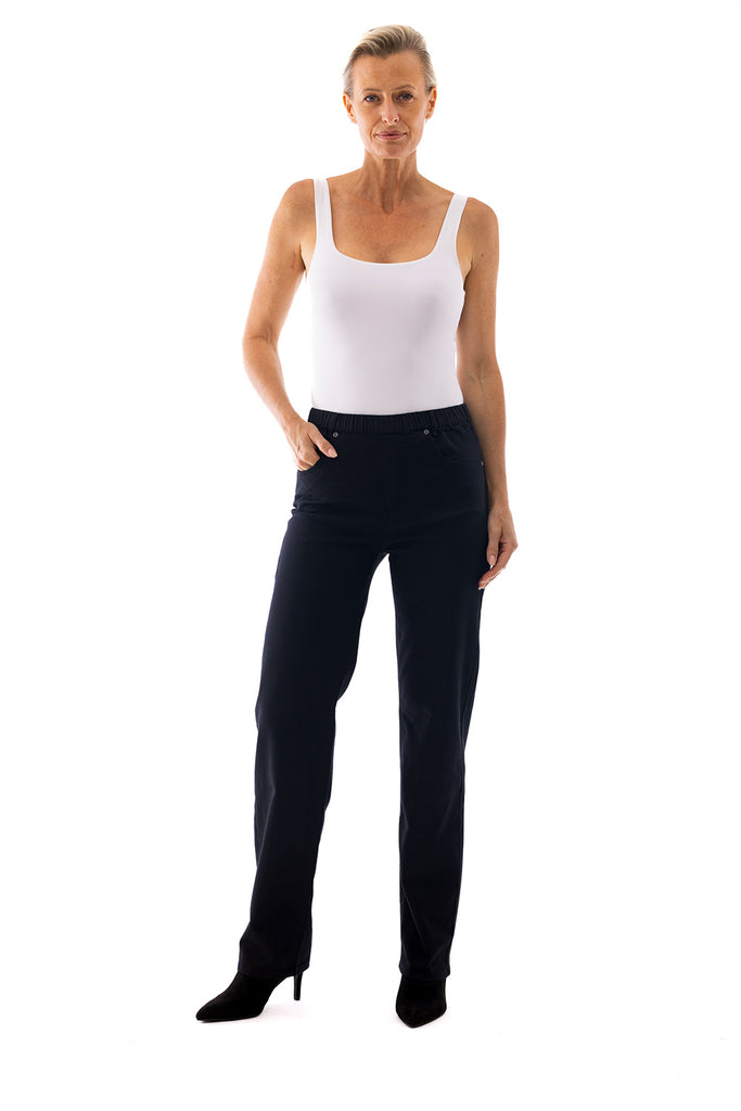These jeans feature a pull-on design with an elastic waistband, making them easy to wear and comfortable throughout the day. The absence of buttons and zippers adds to the streamlined look and comfort.  The jeans are full-length, providing coverage and a sleek appearance, and have a straight leg with a slightly wider cut offering a modern take on classic jeans, making them flattering for various body types.  The jeans include both front and back pockets, adding functionality and a touch of classic jean styling.