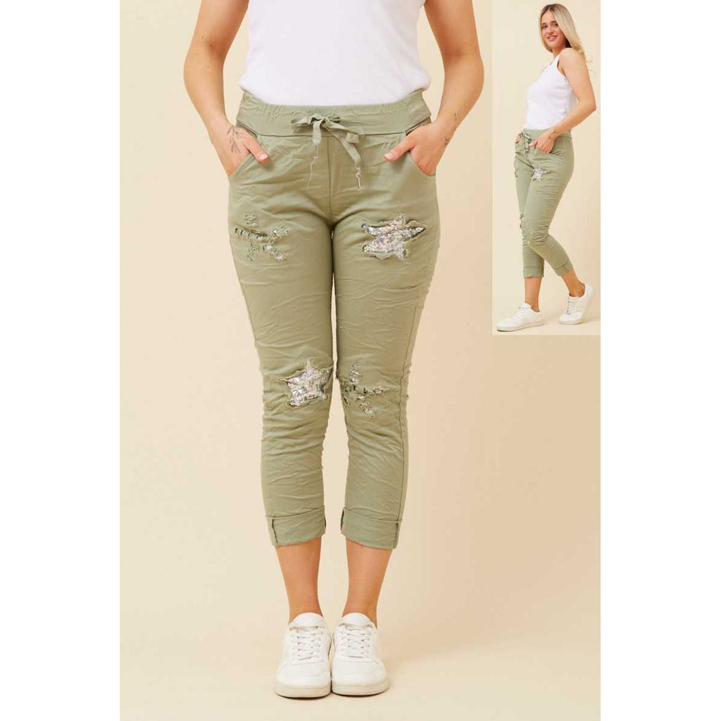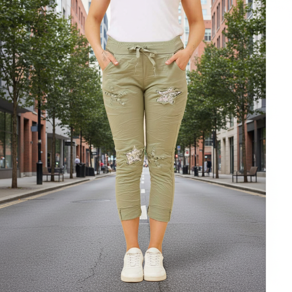 Elevate your wardrobe with these sophisticated khaki pants, featuring eye-catching sequin patches that add a touch of glamour to an otherwise understated silhouette. Perfect for transitioning from day to evening, these versatile trousers blend timeless tailoring with contemporary embellishment. The neutral khaki base ensures easy pairing with your existing pieces, while the sequin detailing makes a subtle yet striking statement. Ideal for those who appreciate refined style with an unexpected twist.