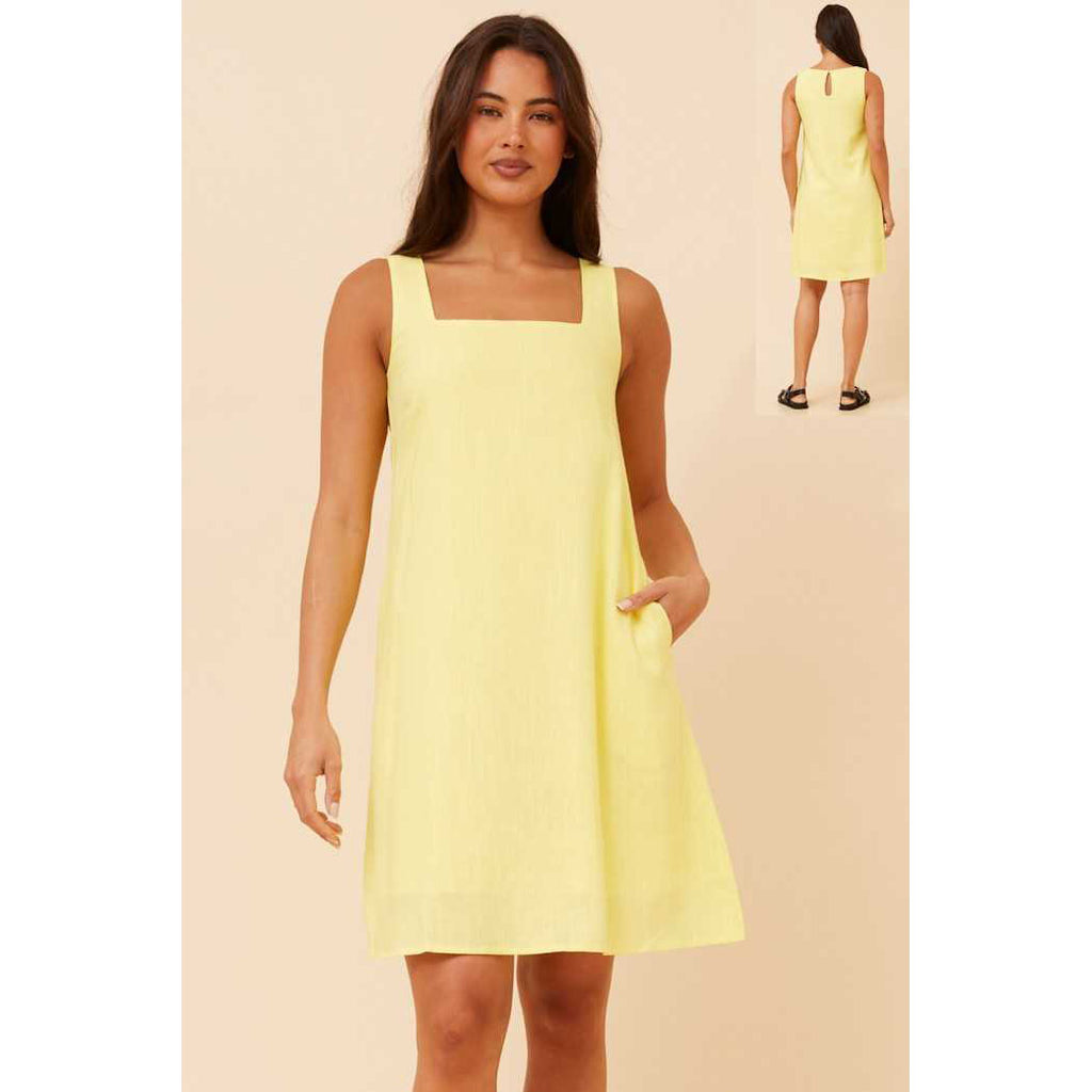 Effortlessly elegant, this short dress combines breathable cotton-linen blend with the practical luxury of functional pockets. The lemon hue brings a refined warmth to any wardrobe, while the lightweight fabric ensures comfort through warmer months. Perfect for casual sophistication, from weekend gatherings to relaxed weekday styling.