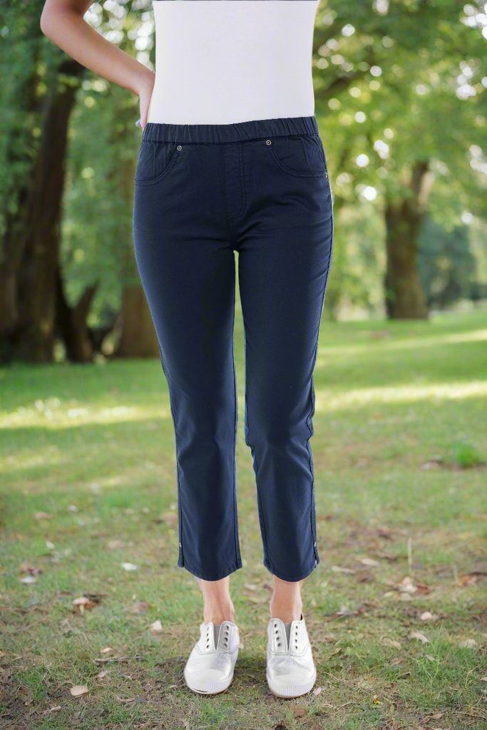 The cropped jeans by Café Latte in Navy are designed to offer both comfort and a sleek, stylish look.