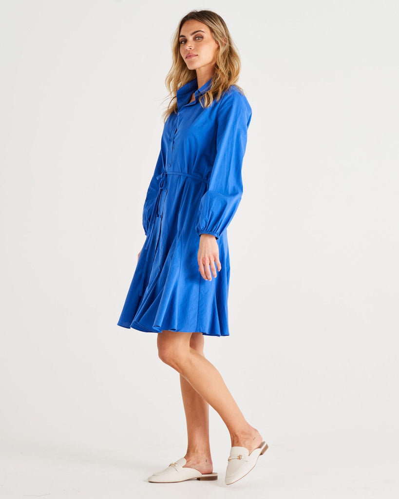 Whether you're heading to brunch or out for a casual evening, the Jada Dress effortlessly blends comfort and style. With its easygoing fit, shirt collar, and button-up design, this dress is the epitome of laid-back sophistication. Long sleeves with cuffs add a touch of flair, while the mini flare hem completes the look with Elevate your wardrobe with this versatile piece perfect for those who crave fashion with a relaxed twist. Unwind and embrace the mini-flare fun of the Jada Dress!