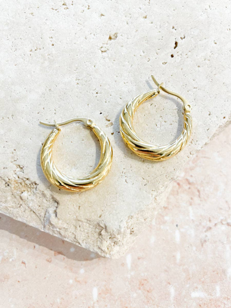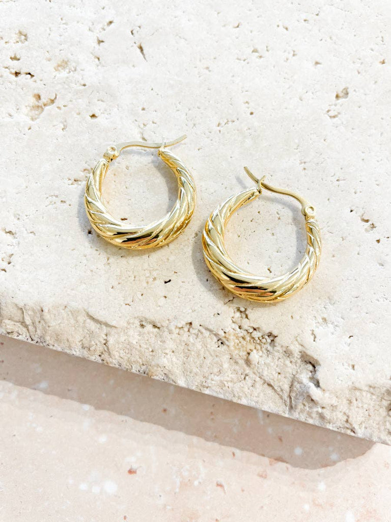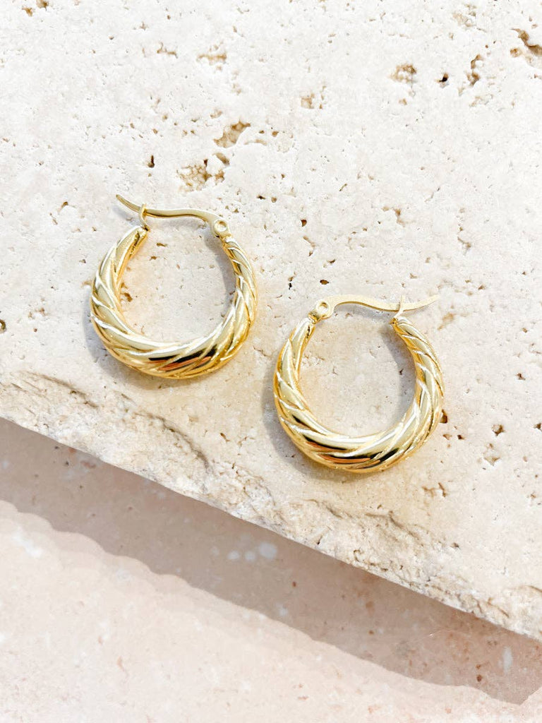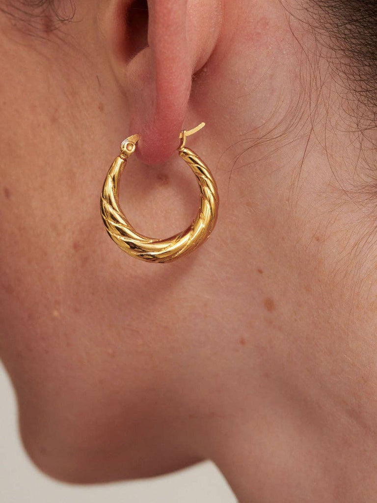 These Spiral Swirl Hoops are beautifully crafted with 18K fine gold plating over a durable brass base, offering both elegance and lasting shine. Each pair comes thoughtfully packaged in a Lustre & Sage faux suede pouch, perfect for safe storage or gifting.
