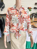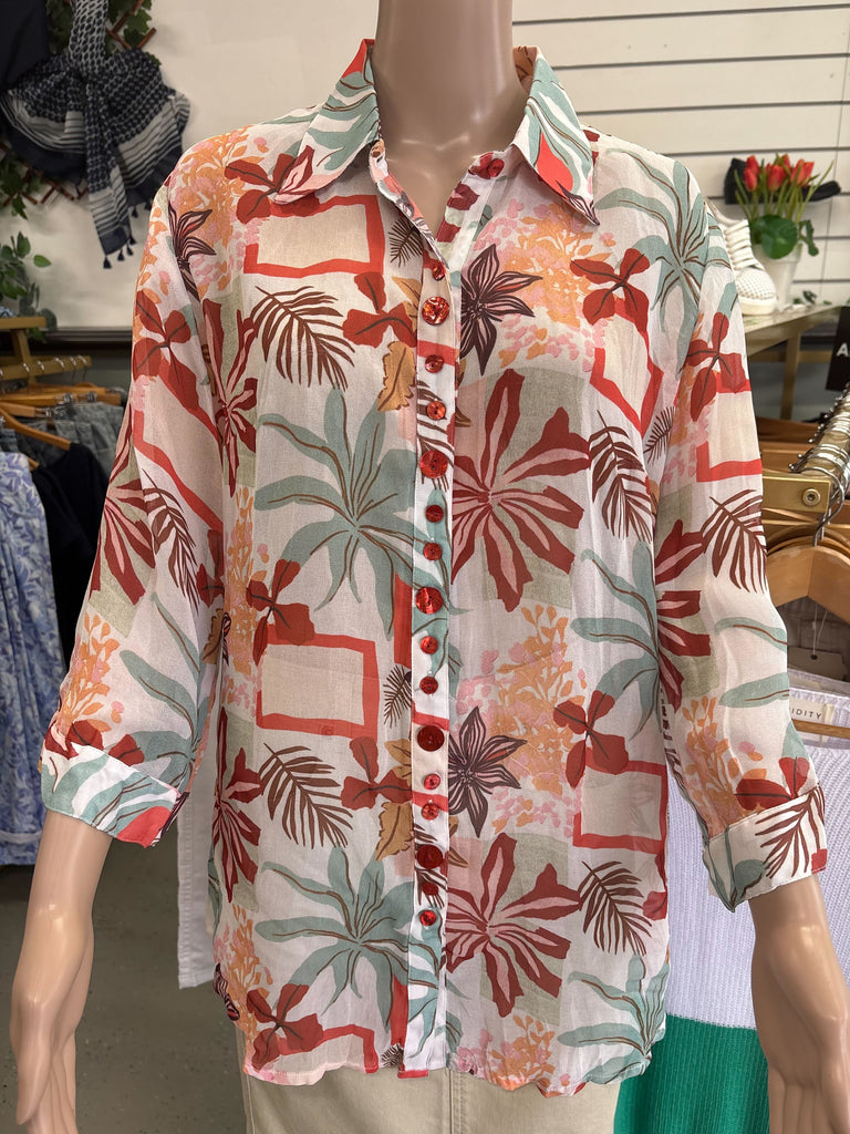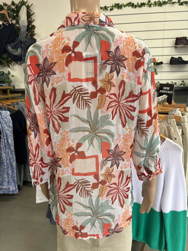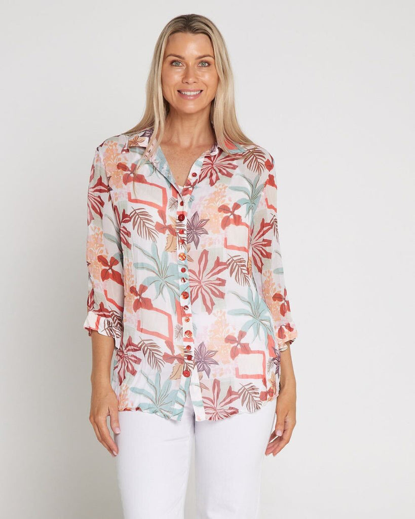 Light, lovely, and effortlessly refined — the Georgette Digital Print Shirt brings a touch of resort charm to your everyday wardrobe. Crafted from sheer crinkle chiffon, it drapes beautifully over the body, revealing a dreamy botanical print in soft coral, aqua, and blush hues. A classic collar and button-through front add polish, while the three-quarter sleeves and airy texture create graceful movement. Wear it over a camisole with crisp white pants for a waterside lunch, or leave it open as a breezy layer on warm evenings.