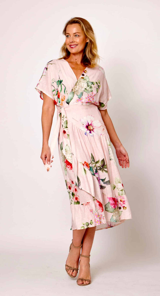 Effortlessly elegant, this wrapped dress combines breathable linen with fluid viscose in a timeless cream base adorned with delicate pink florals. The sophisticated drape of the wrap silhouette flatters the figure while the natural fabric blend ensures comfort throughout the day. Perfect for transitioning from casual gatherings to refined occasions, this piece embodies understated luxury and versatile style.